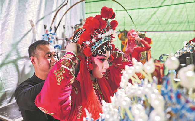 1月29日,在浙江省丽水市缙云县七里乡梅下村,建德市婺剧团的演员们在送戏下乡演出前穿戏服。